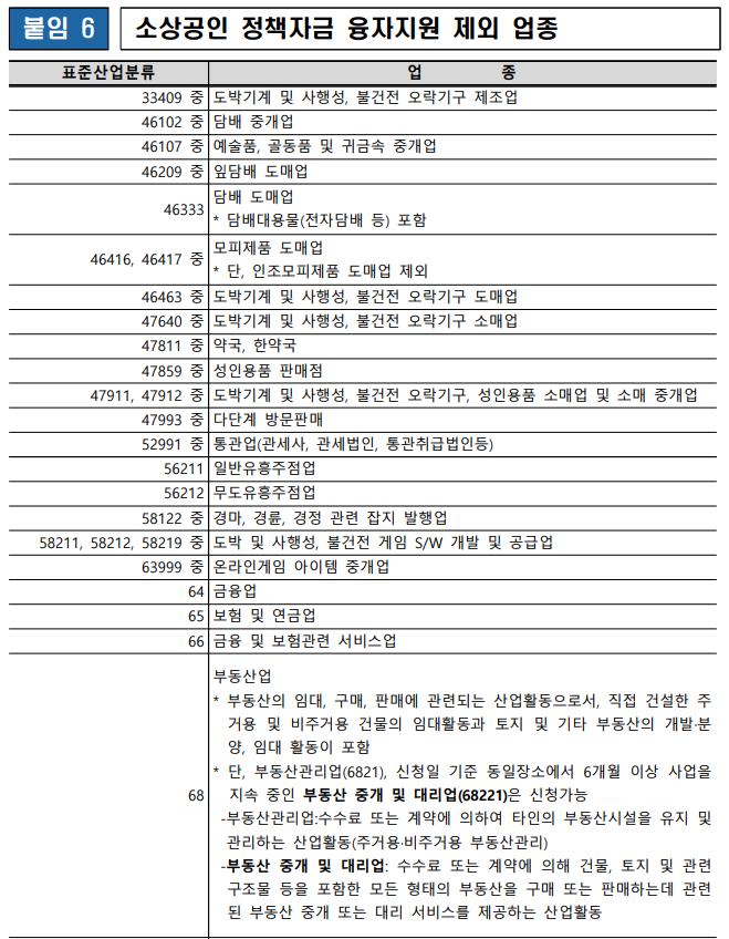 □ 사행성 업종, 변호사 회계사 병원 약국 등 전문직종, 금융보험관련 업종 등 소상공인 정책자금 융자 제외 업종